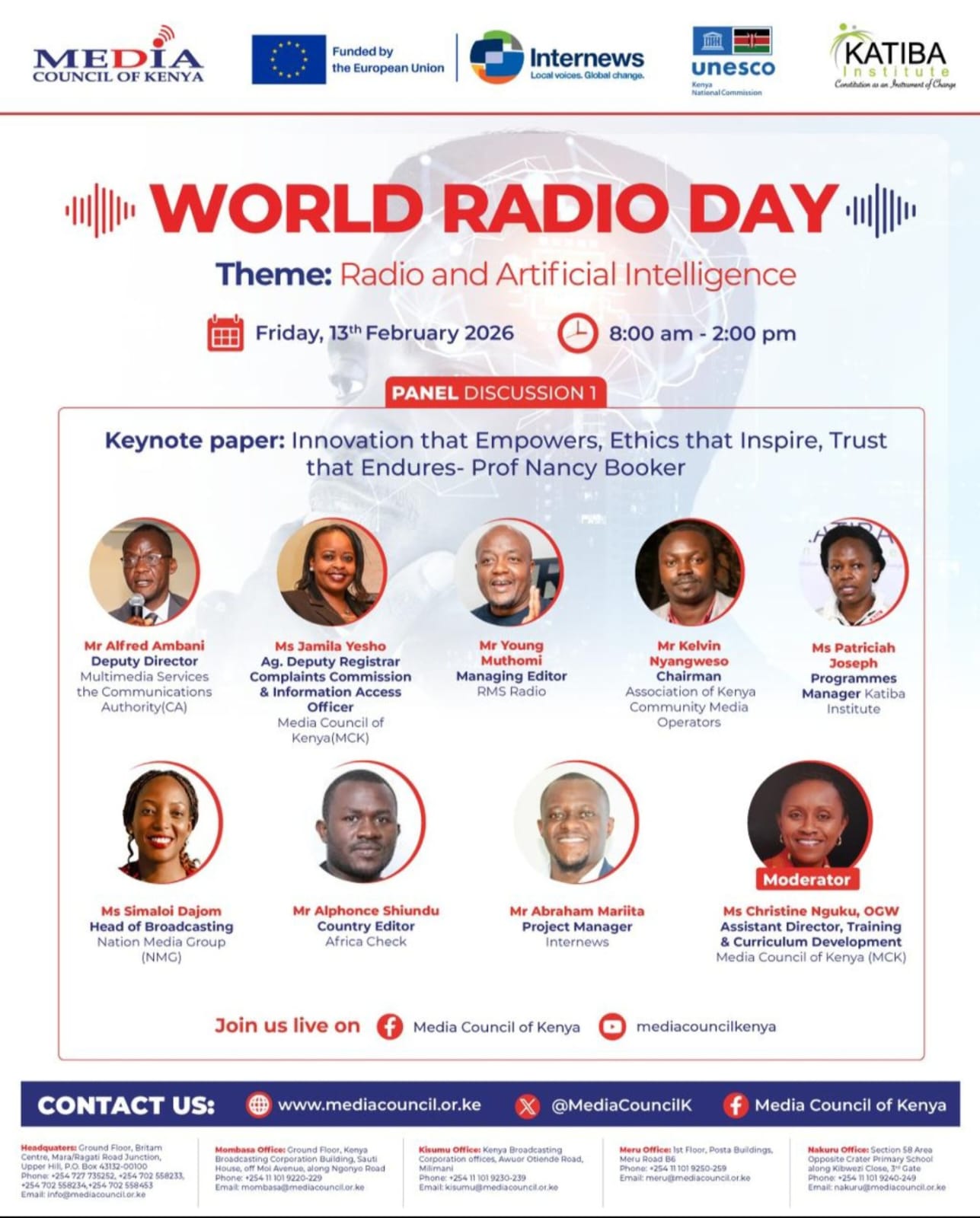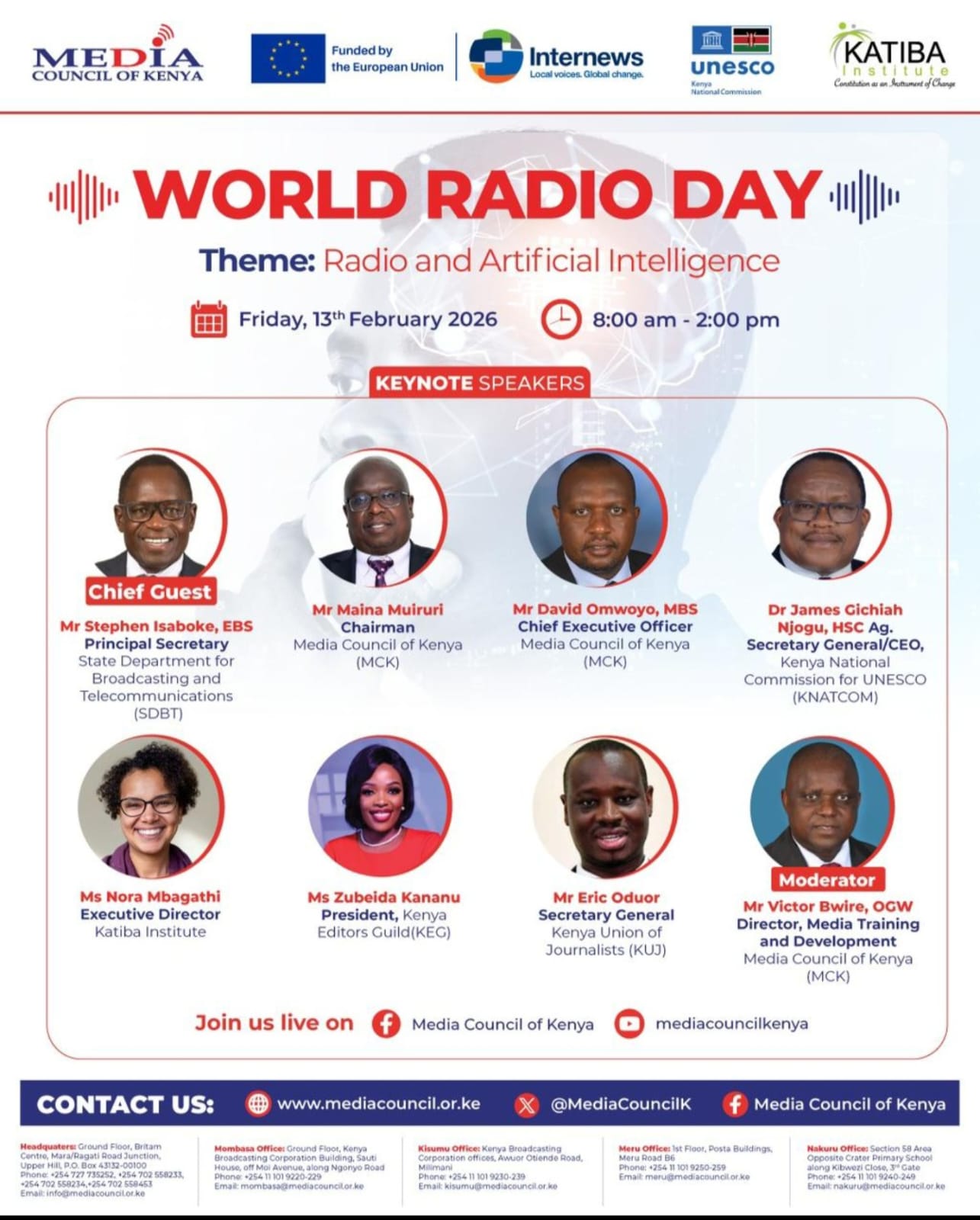 Kenya will tomorrow join the rest of the world in marking World Radio Day 2026, with a series of high-profile events organized by the Media Council of Kenya (MCK) under the theme “Radio and Artificial Intelligence.”