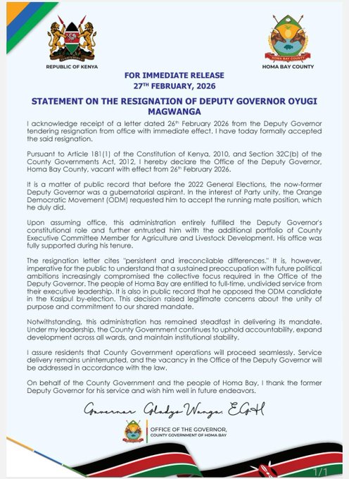 “I acknowledge receipt of a letter dated 26th February 2026 from the Deputy Governor tendering resignation from office with immediate effect. I have today accepted the resignation,” Wanga stated in her official release dated February 27.