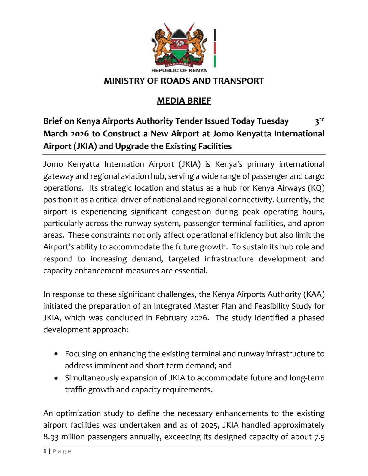 According to a statement on March 3, 2026 by the Cabinet Secretary (CS) for Roads and Transport Davis Chirchir, the expansion will ease congestion, boost passenger capacity, and reinforce Kenya’s role as a gateway to Africa.
