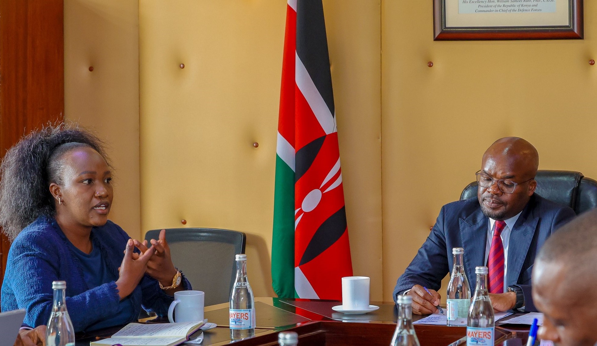 KEPSA’s Security Sector Board Chair, Ms. Annette Kimitei (left) and Principal Secretary, Dr. Raymond Omollo (front right) during the couresy visit. (Photo Credit: Ministry of Interior| Kenya, X)