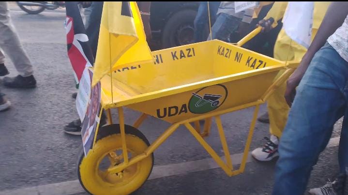 Emmanuel Kipkurui's Wheelbarrow branded in UDA colors. (Photo credit: Michael Njihia)