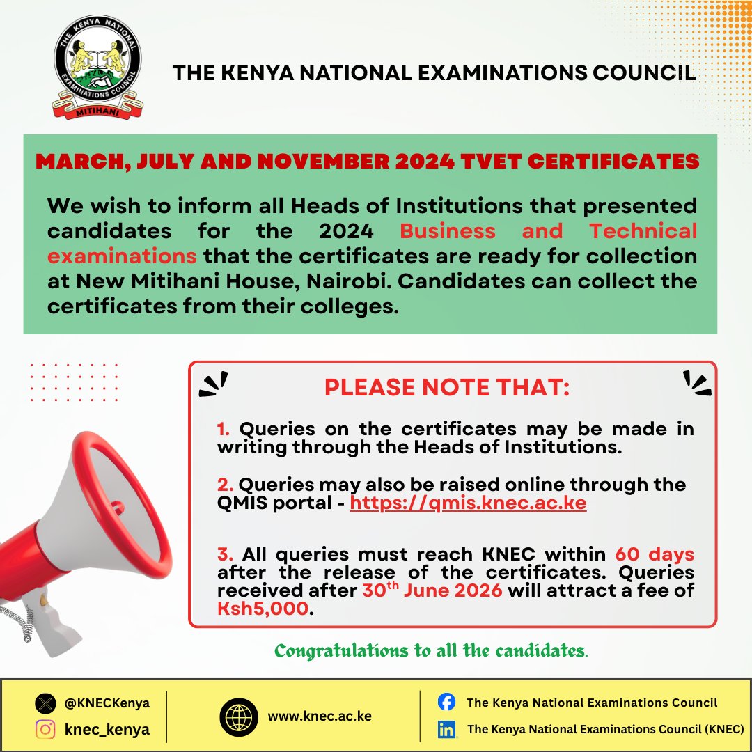 The Kenya National Examinations Council (KNEC) has announced the release of the Technical and Vocational Education and Training (TVET) certificates for candidates who sat for the March, July, and November 2024 Business and Technical examinations.