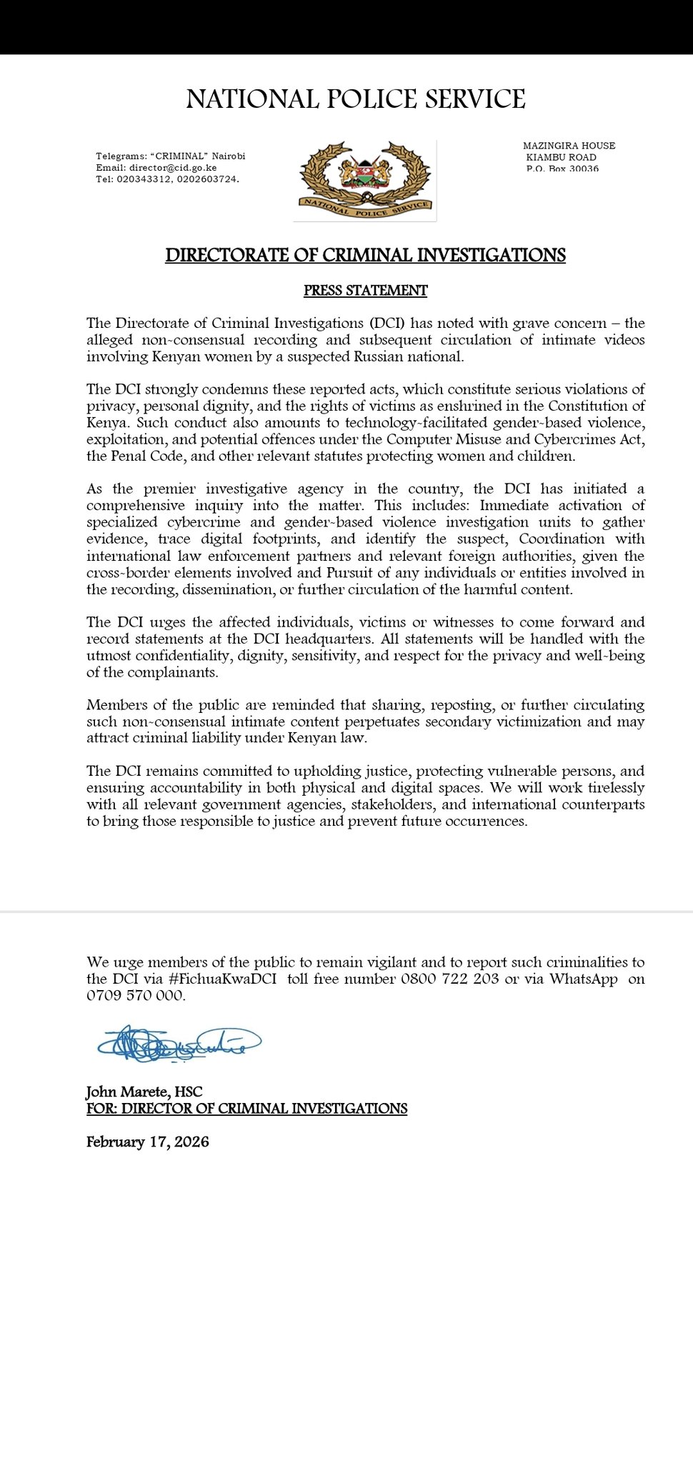 Press statement issued on February 17, 2026 by the Directorate of Criminal Investigations (DCI)