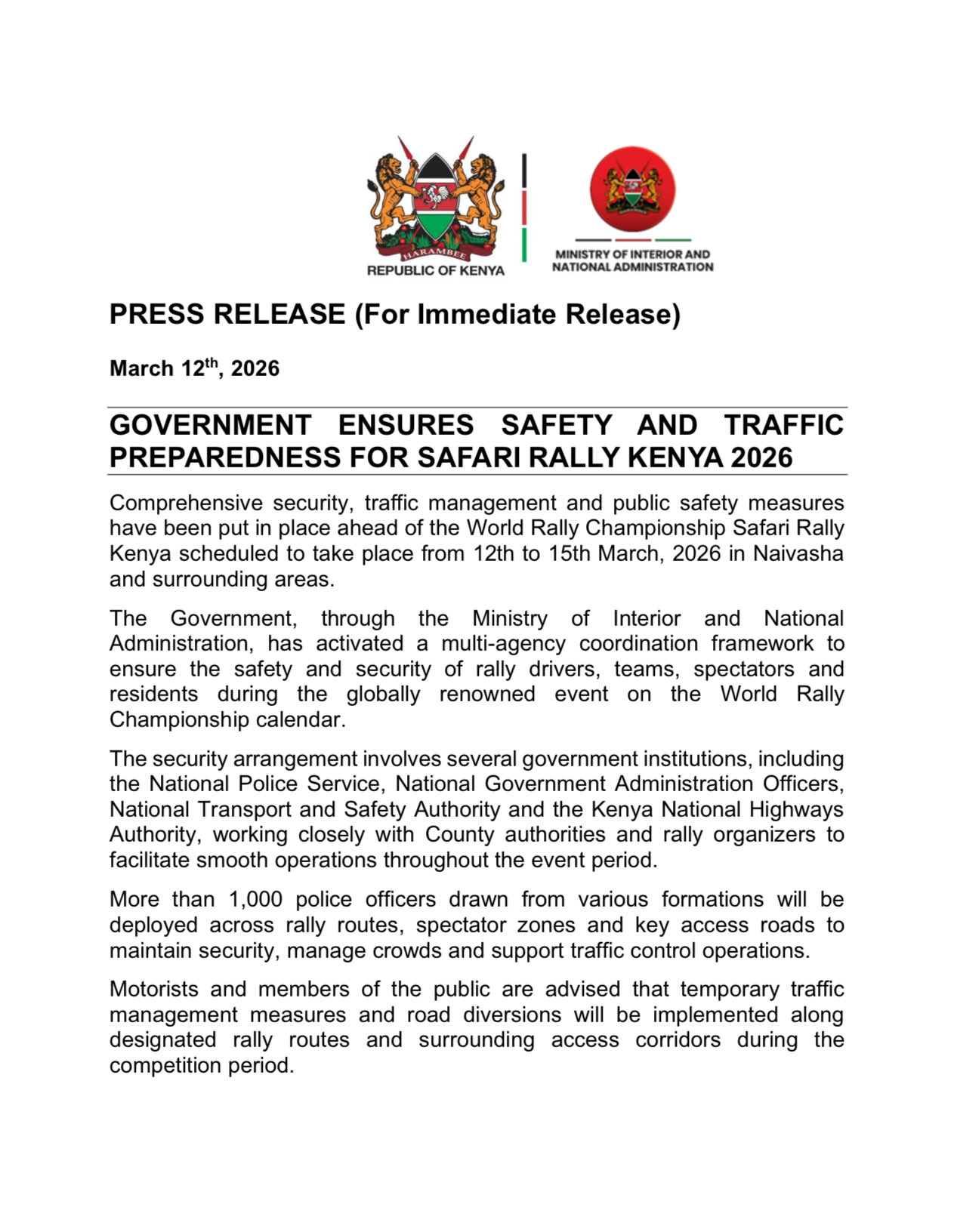 Through a statement on X, the Ministry has confirmed that comprehensive security, traffic management, and public safety measures are in place for the World Rally Championship Safari Rally, scheduled for March 12–15, 2026 in Naivasha and surrounding areas.