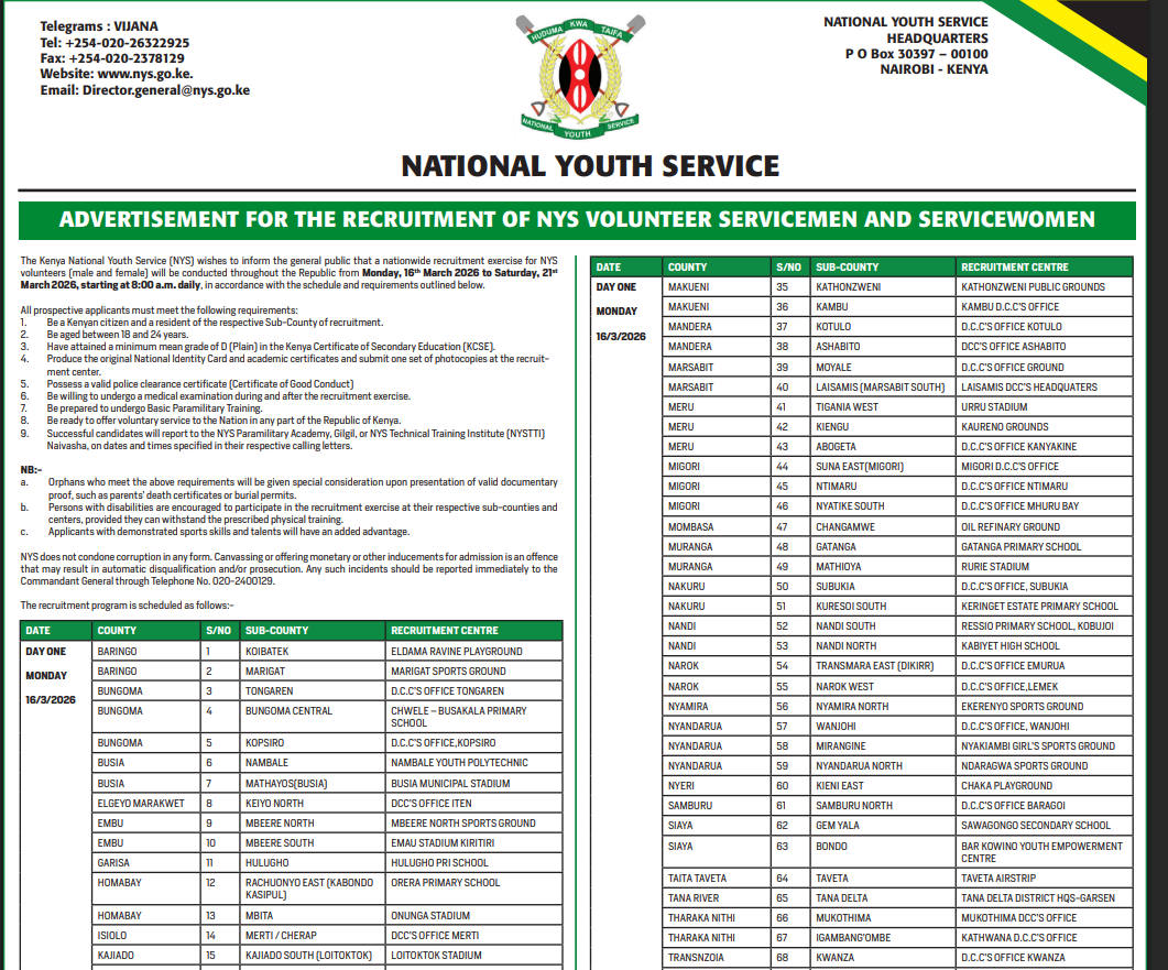 The National Youth Service (NYS) nationwide recruitment exercise has officially kicked off across all sub‑counties, as earlier advertised. The exercise will run from March 16 to 21, 2026.